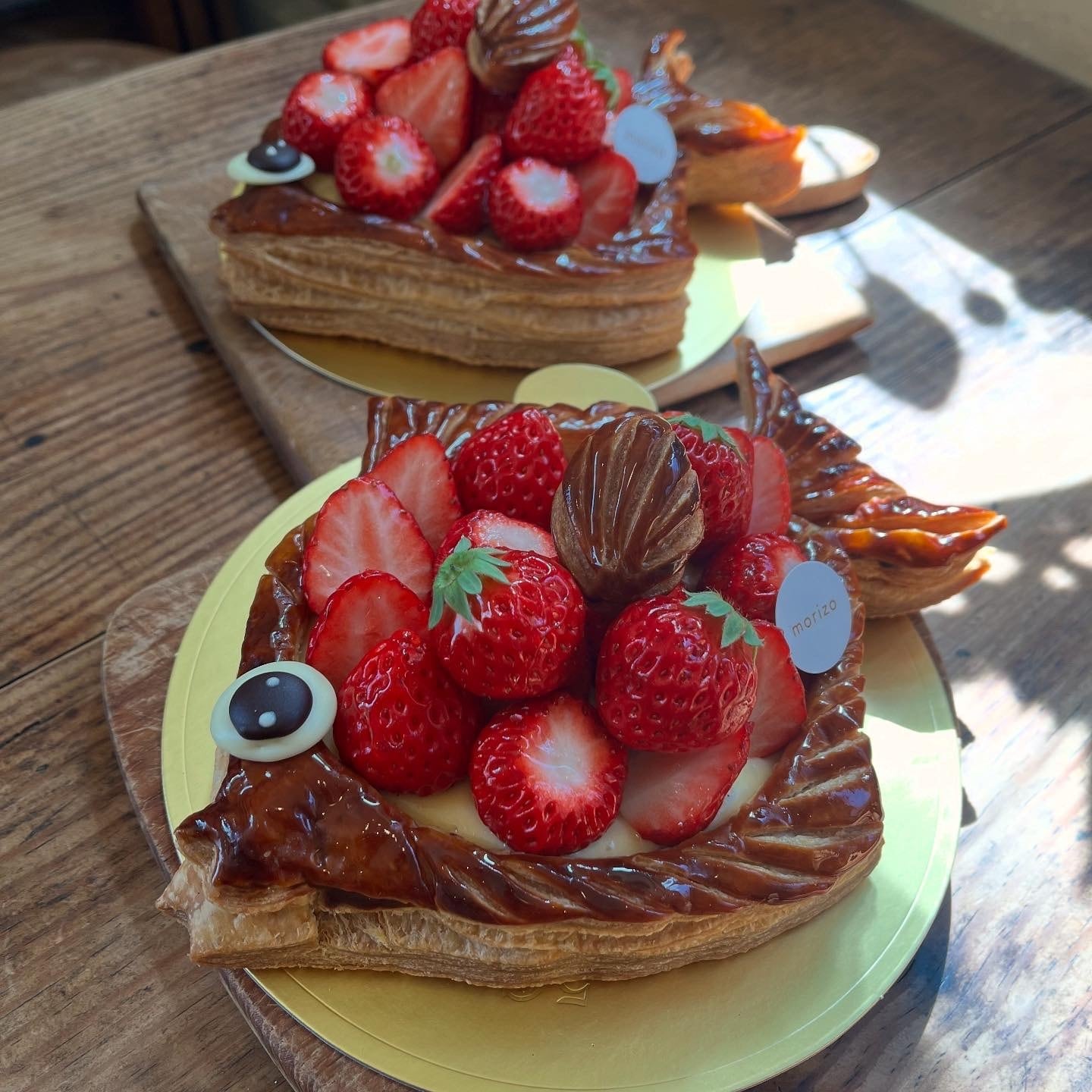 フランスのエイプリルフール「ポワソン・ダブリル」にちなんだ、魚の形のいちごパイです。アーモンドクリームを焼き込んだパイ生地に、カスタードクリーム、フランボワーズジャム、いちご。